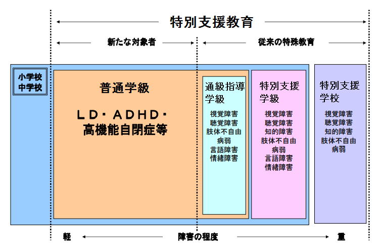 | 対象 | 言語障がい、自閉症、情緒障がい、弱視、難聴、学習障がい(LD)、注意欠陥他動性障がい(ADHD)、肢体不自由、病弱・身体虚弱 |
